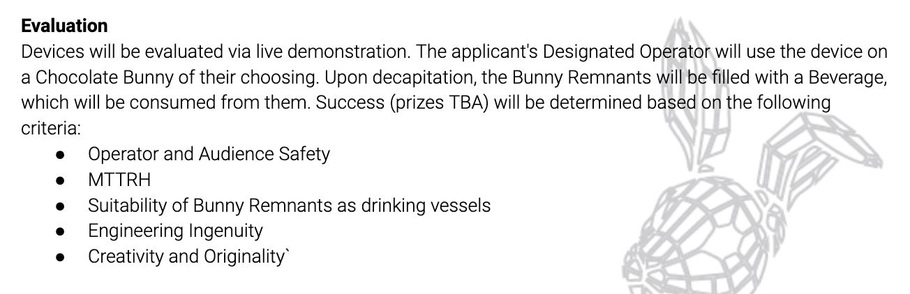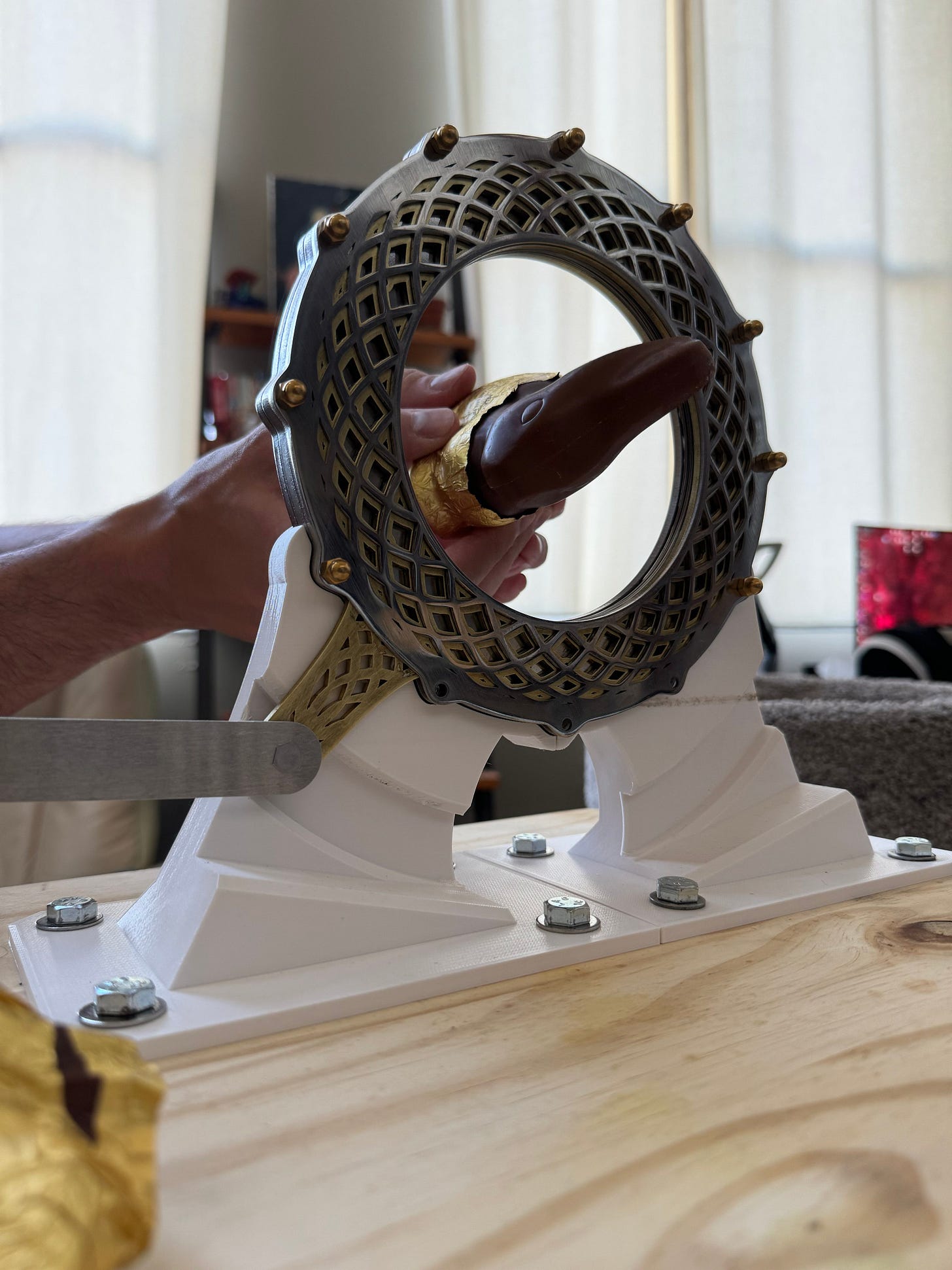 As we’ve gotten older, the focus of the party has become less and less the drinking, and more and more the ridiculous devices for the decapitation of the bunnies. Early events had a simple-yet-iconic gravity-powered guillotine made by the host and his roommate, but later ones encouraged people to bring their own decapitators. There have been literal mousetrap-powered contraptions, electrically-heated resistance-wire garottes, and other such contrivances. In 2022, I brought a portable circular saw, and in 2023, a large bread knife heated red-hot by a propane torch. Both were fun, and provided a dramatic flair to the decapitation (the hot knife caused the chocolate to briefly catch fire while cutting), but relatively uncomplicated in design or execution.